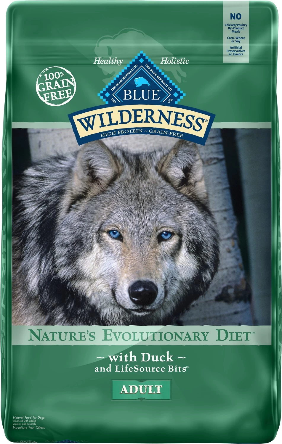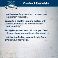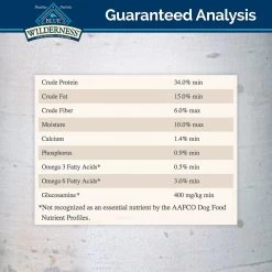 Deboned Duck, Chicken Meal (source of Glucosamine), Peas, Pea Protein, Menhaden Fish Meal (source of Omega 3 Fatty Acids), Tapioca Starch, Dried Tomato Pomace, Chicken Fat (preserved with Mixed Tocopherols), Pea Starch, Flaxseed (source of Omega 6 Fatty Acids), Dried Egg, Natural Flavor, Dehydrated Alfalfa Meal, DL-Methionine, Dried Chicory Root, Potatoes, Pea Fiber, Calcium Carbonate, Caramel Color, Choline Chloride, Salt, preserved with Mixed Tocopherols, Sweet Potatoes, Carrots, Potassium Chloride, Zinc Amino Acid Chelate, Zinc Sulfate, Ferrous Sulfate, Vitamin E Supplement, Iron Amino Acid Chelate, Blueberries, Cranberries, Barley Grass, Parsley, Yucca Schidigera Extract, Dried Kelp, Turmeric, Nicotinic Acid (Vitamin B3), Calcium Pantothenate (Vitamin B5), L-Ascorbyl-2-Polyphosphate (source of Vitamin C), L-Carnitine, L-Lysine, Oil of Rosemary, Copper Sulfate, Biotin (Vitamin B7), Vitamin A Supplement, Copper Amino Acid Chelate, Manganese Sulfate, Taurine, Manganese Amino Acid Chelate, Thiamine Mononitrate (Vitamin B1), Riboflavin (Vitamin B2), Vitamin D3 Supplement, Vitamin B12 Supplement, Pyridoxine Hydrochloride (Vitamin B6), Calcium Iodate, Dried Yeast, Dried Enterococcus faecium fermentation product, Dried Lactobacillus acidophilus fermentation product, Dried Aspergillus niger fermentation extract, Dried Trichoderma longibrachiatum fermentation extract, Dried Bacillus subtilis fermentation extract, Folic Acid (Vitamin B9), Sodium Selenite. 3,597 kcal/kg, 416 kcal/cup