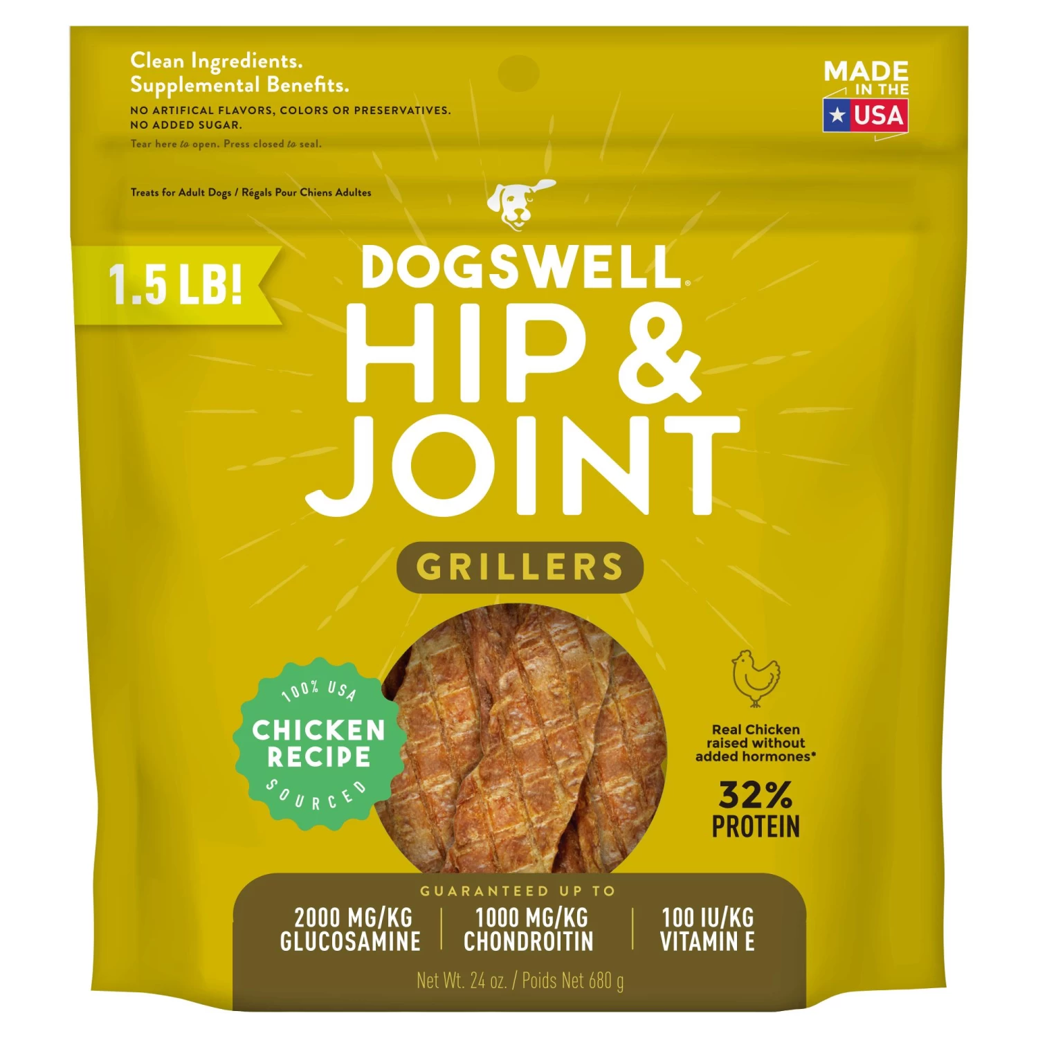 Support your dog’s active lifestyle with a chewy meaty treat that tastes good and does good. High-quality protein from real chicken maintains muscle mass and delivers a smoky, grilled flavor dog’s love while glucosamine, chondroitin and nutrients work to promote your dog’s hip and joint health now and into the future.