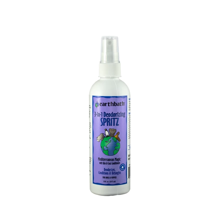 This 3-in-1 Deodorizing Spritz naturally conditions and detangles coats, while deodorizing with the fresh botanical fragrance of rosemary oil. Organic aloe vera and vitamin E leave the coat exceptionally soft and bright. Use between baths to freshen, condition and detangle, or as a finishing spray after bathing your dog with earthbath shampoo. Safe for dogs over 6 weeks old. Not for use on cats.