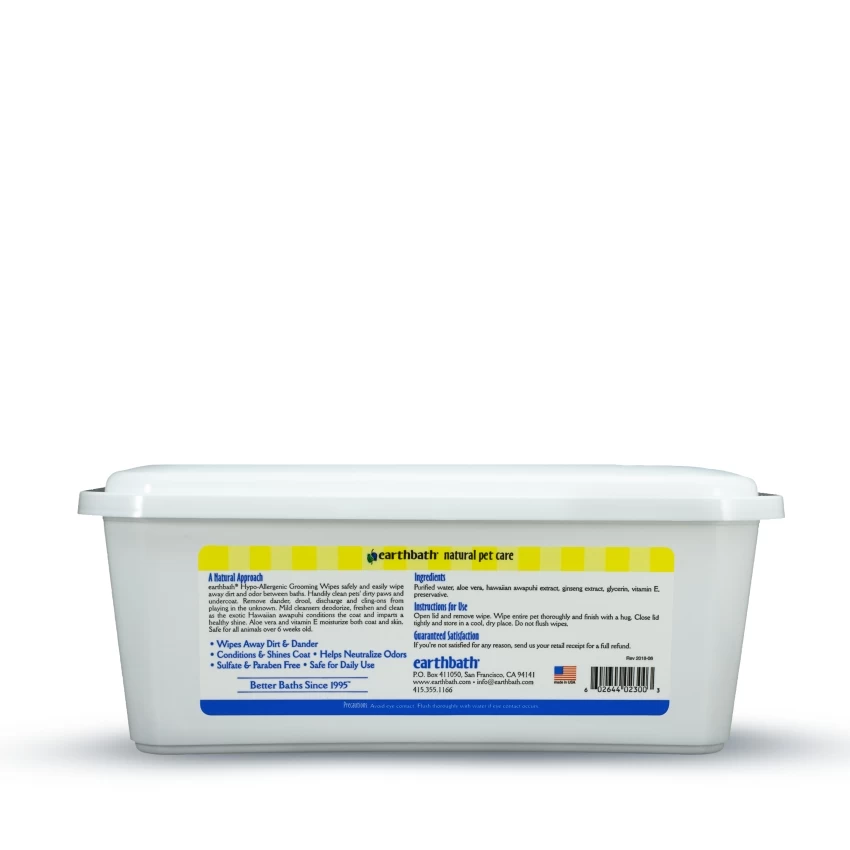 earthbath® Hypo-Allergenic Grooming Wipes safely and easily wipe away dirt & odor between baths. Handily clean pets’ dirty paws and undercoat. Remove dander, drool, discharge, and cling-ons from playing in the unknown. Mild cleansers deodorize, freshen, and clean as the exotic Hawaiian Awapuhi conditions the coat and imparts a healthy shine. Aloe vera & vitamin E moisturize both coat and skin. Safe for animals over 6 weeks old.