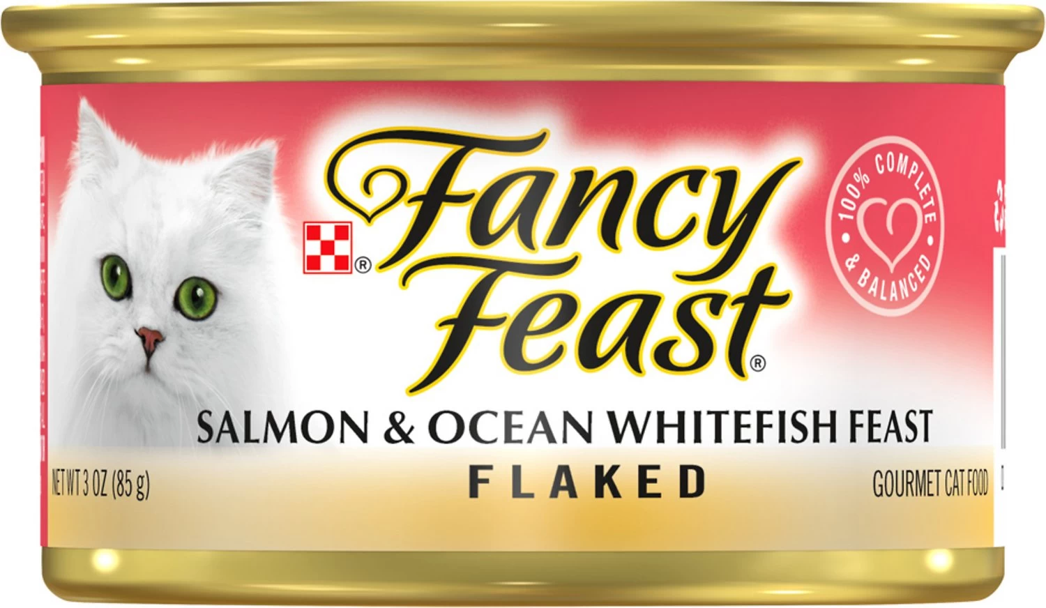 Fish Broth, Fish, Salmon, Chicken, Liver, Ocean Whitefish, Wheat Gluten, Meat By-Products, Soy Flour, Soy Protein Concentrate, Artificial And Natural Flavors, Added Color, Minerals [Potassium Chloride, Zinc Sulfate, Ferrous Sulfate, Manganese Sulfate, Copper Sulfate, Potassium Iodide], Xanthan Gum, Taurine, Salt, Carrageenan, Choline Chloride, Red 3, Vitamins [Thiamine Mononitrate (Vitamin B-1), Vitamin E Supplement, Niacin (Vitamin B-3), Calcium Pantothenate (Vitamin B-5), Vitamin A Supplement, Menadione Sodium Bisulfite Complex (Vitamin K), Pyridoxine Hydrochloride (Vitamin B-6), Riboflavin Supplement (Vitamin B-2), Vitamin B-12 Supplement, Biotin (Vitamin B-7), Folic Acid (Vitamin B-9), Vitamin D-3 Supplement]. C-6903. 1,214 kcal/kg, 103 kcal/can