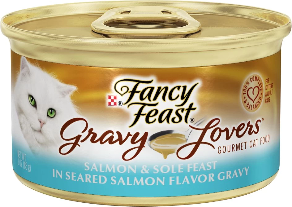 Fish Broth, Salmon, Wheat Gluten, Liver, Meat By-Products, Chicken, Corn Starch-Modified, Sole, Artificial and Natural Flavors, Soy Flour, Salt, Calcium Phosphate, Added Color, Potassium Chloride, Natural Seared Salmon Flavor, Taurine, Magnesium Sulfate, Choline Chloride, Red 3, Thiamine Mononitrate, Vitamin E Supplement, Zinc Sulfate, Ferrous Sulfate, Niacin, Calcium Pantothenate, Copper Sulfate, Vitamin A Supplement, Manganese Sulfate, Menadione Sodium Bisulfite Complex (Source of Vitamin K Activity), Pyridoxine Hydrochloride, Riboflavin Supplement, Vitamin B-12 Supplement, Biotin, Folic Acid, Vitamin D-3 Supplement, Potassium Iodide. 763 kcal/kg, 64 kcal/can