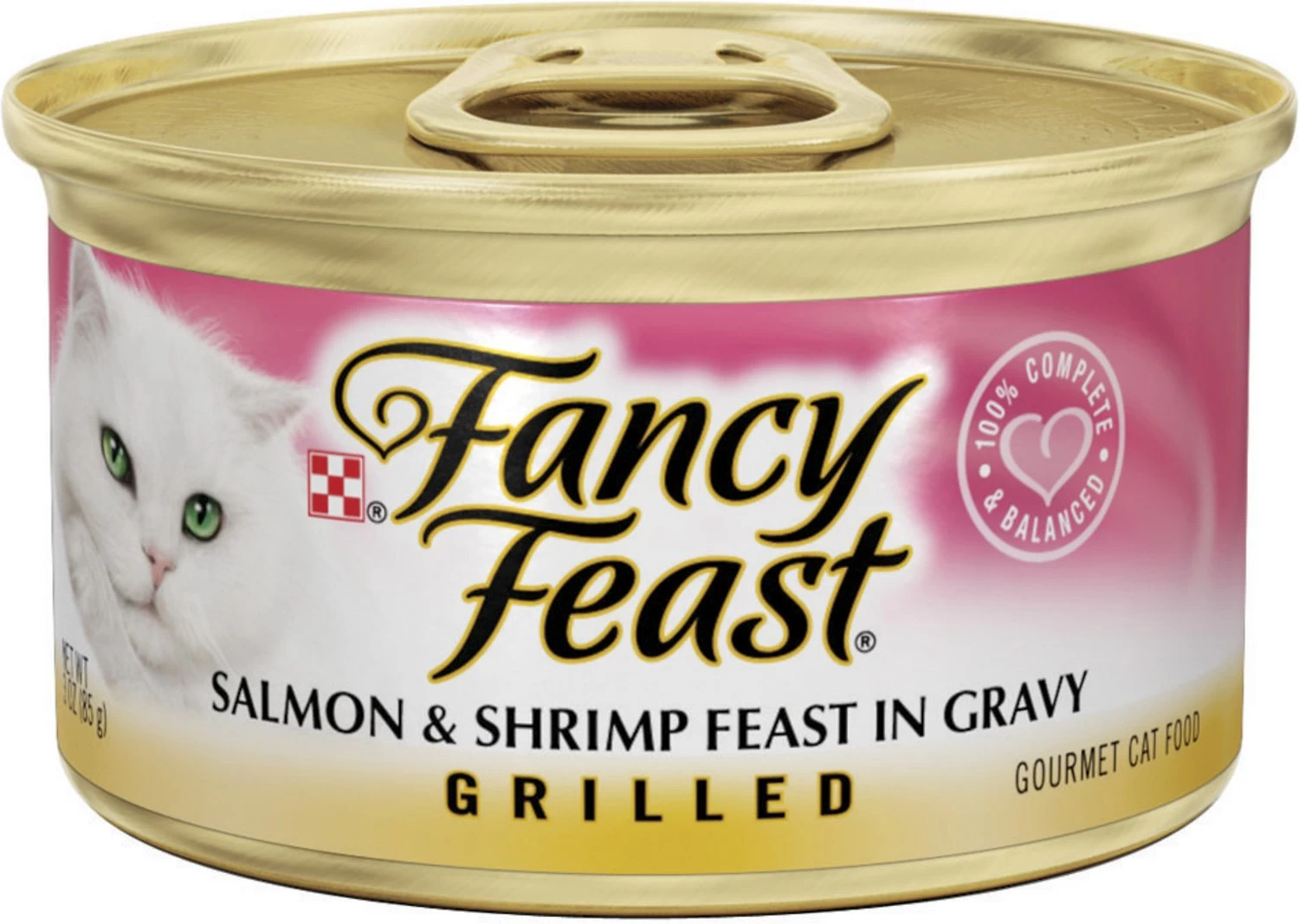 Fish Broth, Salmon, Wheat Gluten, Liver, Meat By-Products, Chicken, Corn Starch-Modified, Shrimp, Artificial and Natural Flavors, Tricalcium Phosphate, Salt, Soy Protein Concentrate, Added Color, Corn Oil, Potassium Chloride, Taurine, Choline Chloride, Magnesium Sulfate, Red 3, Thiamine Mononitrate, Vitamin E Supplement, Zinc Sulfate, Ferrous Sulfate, Niacin, Calcium Pantothenate, Vitamin A Supplement, Copper Sulfate, Menadione Sodium Bisulfite Complex (Source of Vitamin K Activity), Manganese Sulfate, Pyridoxine Hydrochloride, Riboflavin Supplement, Vitamin B-12 Supplement, Biotin, Folic Acid, Vitamin D-3 Supplement, Potassium Iodide.