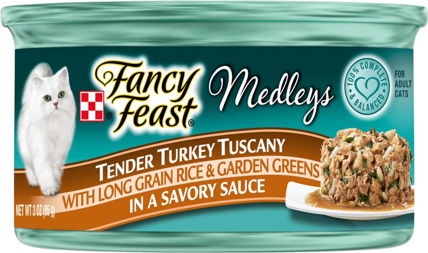 Poultry Broth, Turkey, Wheat Gluten, Liver, Long Grain Rice, Meat By-Products, Spinach, Corn Starch-Modified, Artificial and Natural Flavors, Salt, Tricalcium Phosphate, Soy Protein Concentrate, Added Color, Potassium chloride, Taurine, Magnesium Sulfate, Choline Chloride, Thiamine Mononitrate, Vitamin E Supplement, Zinc Sulfate, Ferrous Sulfate, Niacin, Calcium Pantothenate, Vitamin A Supplement, Copper Sulfate, Menadione Sodium Bisulfite Complex (Source of Vitamin K Activity), Manganese Sulfate, Pyridoxine Hydrochloride, Riboflavin Supplement, Vitamin B-12 Supplement, Biotin, Folic Acid, Vitamin D-3 Supplement, Potassium Iodide.
