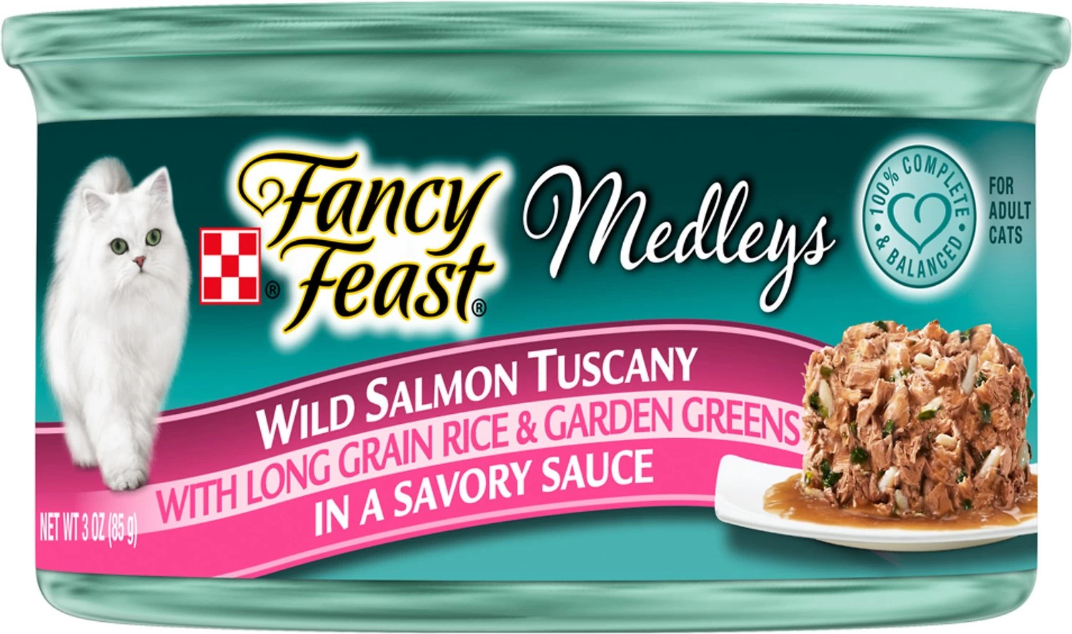 Fish Broth, Salmon, Wheat Gluten, Liver, Long Grain Rice, Spinach, Corn Starch-Modified, Meat By-Products, Chicken, Artificial and Natural Flavors, Salt, Added Color, Tricalcium Phosphate, Soy Protein Concentrate, corn Oil, Potassium Chloride, Taurine, Choline Chloride, Red 3, Magnesium Sulfate, Thiamine Mononitrate, Vitamin E Supplement, Zinc Sulfate, Ferrous Sulfate, Niacin, Calcium Pantothenate, Vitamin A Supplement, Menadione Sodium Bisulfite Complex (Source of Vitamin K Activity), Copper Sulfate, Manganese Sulfate, Pyridoxine Hydrochloride, Riboflavin Supplement, Vitamin B-12 Supplement, Biotin, Folic Acid, Vitamin D-3 Supplement, Potassium Iodide.