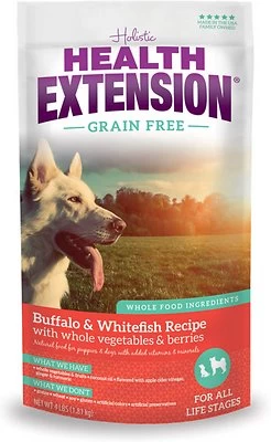 Prepared with delicious, whole food ingredients, our Grain Free Buffalo & Whitefish Recipe is packed with every nutrient canines need to thrive. Free range buffalo is the first ingredient, so you know your pet is getting healthy levels of animal protein in every bite. The second ingredient, deboned whitefish, is an excellent source of Omega 3’s. This complete and balanced dry dog food also includes a hearty helping of chickpeas, whole garden vegetables and antioxidant-rich berries. Along with a proprietary blend of cutting-edge ingredients like turmeric, apple cider vinegar, natural probiotics and pure coconut oil. With nutrients like these, our Grain Free Buffalo & Whitefish Recipe offers everything dogs and puppies require for a long, healthy and happy life.