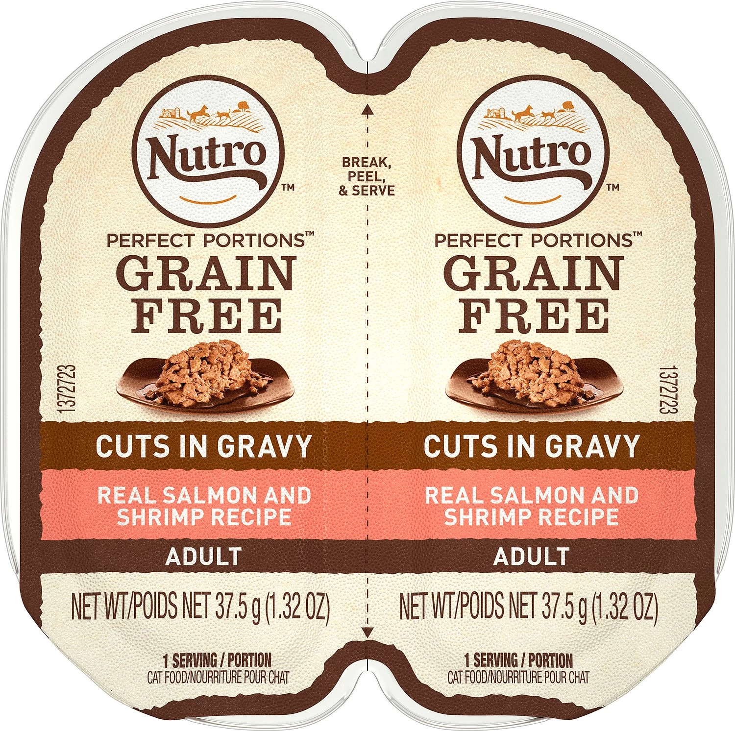 Chicken Broth, Salmon, Chicken, Chicken Liver, Shrimp, Pork Plasma, Tapioca Starch, Potassium Chloride, Sunflower Oil (preserved with Mixed Tocopherols), Salt, Calcium Carbonate, Magnesium Sulfate, Xanthan Gum, Sodium Acid Pyrophosphate, Tetrasodium Pyrophosphate, Choline Chloride, Sodium Hexametaphosphate, Taurine, Thiamine Mononitrate (Vitamin B1), Vitamin E Supplement, Zinc Sulfate, Ferrous Sulfate, Manganese Sulfate, Potassium Iodide, Pyridoxine Hydrochloride (Vitamin B6), Copper Sulfate, Vitamin D3 Supplement, Folic Acid, Menadione Sodium Bisulfite Complex (source of Vitamin K Activity). 876 kcal/kg, 33 kcal/serving