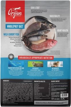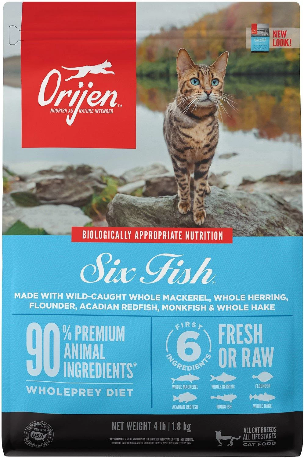 Help your pet thrive with the power of protein-rich recipes that nourish as nature intended. As obligate carnivores, modern cats are built like their ancestors and thrive on a Biologically Appropriate diet rich in protein and fat sourced from a variety of animal ingredients. ORIJEN® Six Fish is made with fish, organs, and edible bone from raw** whole mackerel, whole herring, flounder, Acadian redfish, monkfish, and silver hake. With rich inclusions of Wholeprey animals, ORIJEN is made with the most nutrient-dense, succulent parts of the prey to deliver the nutrition cats need. With 90%* quality animal ingredients and coated with freeze-dried liver, this diet is beyond comparison.