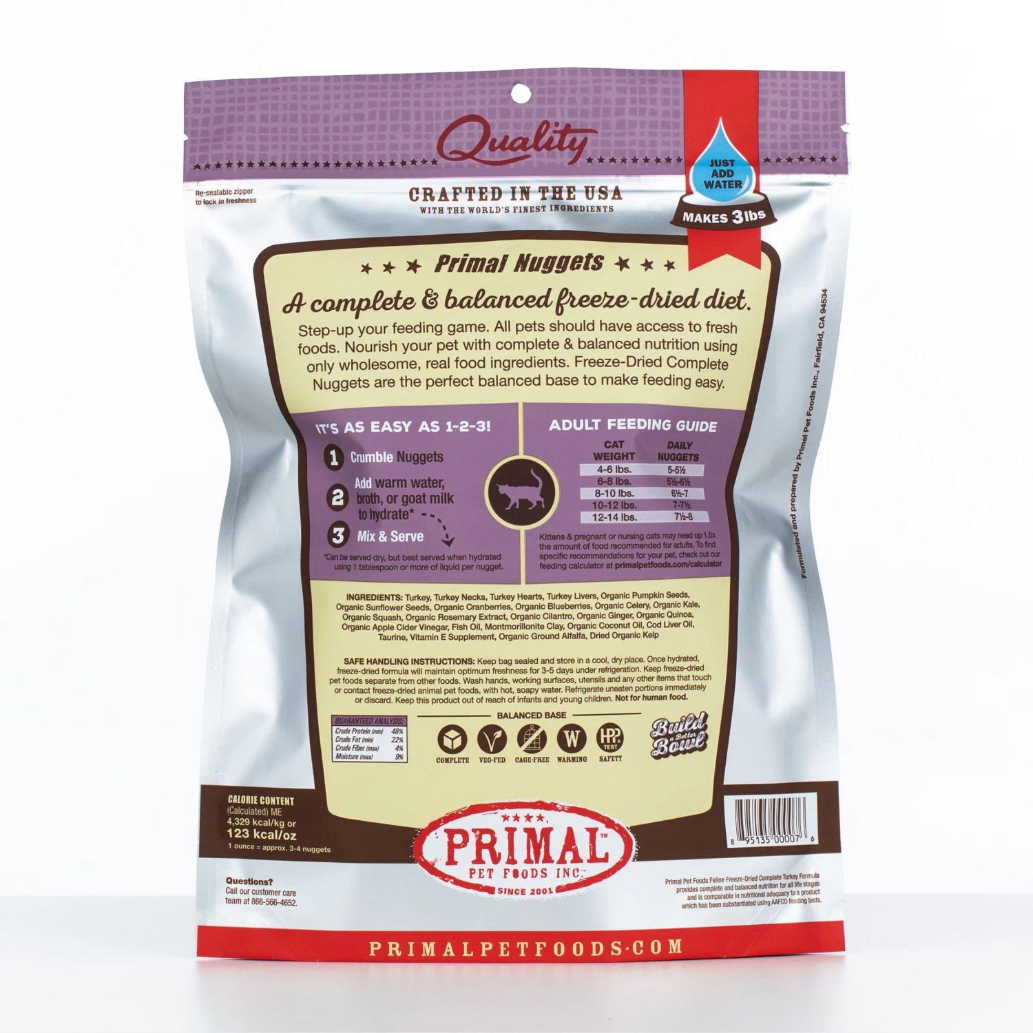 Turkey (with ground bone), Turkey Livers, Organic Pumpkin Seeds, Organic Sunflower Seeds, Organic Cranberries, Organic Blueberries, Organic Celery, Organic Kale, Organic Squash, Organic Rosemary Extract, Organic Cilantro, Organic Ginger, Organic Quinoa, Organic Apple Cider Vinegar, Fish Oil, Montmorillonite Clay, Organic Coconut Oil, Cod Liver Oil, Taurine, Vitamin E Supplement, Organic Ground Alfalfa, Dried Organic Kelp