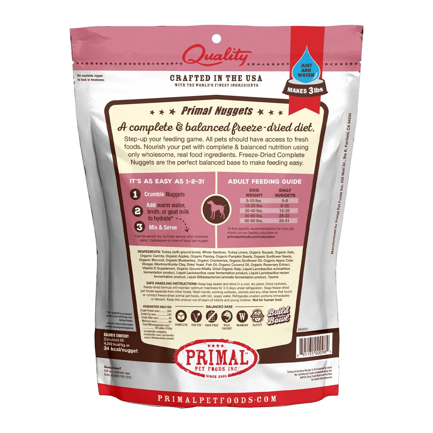 Turkey (with ground bone), Whole Sardines, Turkey Livers, Organic Squash, Organic Kale, Organic Carrots, Organic Apples, Organic Parsley, Organic Pumpkin Seeds, Organic Sunflower Seeds, Organic Broccoli, Organic Blueberries, Organic Cranberries, Organic Sunflower Oil, Organic Apple Cider Vinegar, Montmorillonite Clay, Dried Yeast, Fish Oil, Organic Coconut Oil, Organic Rosemary Extract, Vitamin E Supplement, Organic Ground Alfalfa, Dried Organic Kelp, Liquid Lactobacillus acidophilus fermentation product, Liquid Lactobacillus casei fermentation product, Liquid Lactobacillus reuteri fermentation product, Liquid Bifidobacterium animalis fermentation product, Taurine