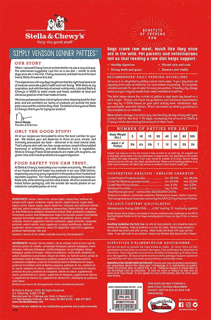 These Simply Venison freeze-dried patties (14 oz offering) are formulated to mirror a dog’s ancestral diet! There has never been a more convenient way to feed a biologically appropriate raw food diet. We believe dogs deserve to thrive on real, minimally processed food – the way nature intended.