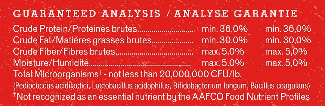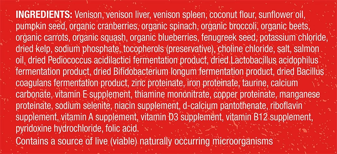 Venison, Venison Liver, Venison Spleen, Coconut Flour, Sunflower Oil, Pumpkin Seed, Organic Cranberries, Organic Spinach, Organic Broccoli, Organic Beets, Organic Carrots, Organic Squash, Organic Blueberries, Fenugreek Seed, Potassium Chloride, Dried Kelp, Sodium Phosphate, Tocopherols (Preservative), Choline Chloride, Salt, Salmon Oil, Dried Pediococcus Acidilactici Fermentation Product, Dried Lactobacillus Acidophilus Fermentation Product, Dried Bifidobacterium Longum Fermentation Product, Dried Bacillus Coagulans Fermentation Product, Zinc Proteinate, Iron Proteinate, Taurine, Calcium Carbonate, Vitamin E Supplement, Thiamine Mononitrate, Copper Proteinate, Manganese Proteinate, Sodium Selenite, Niacin Supplement, D-Calcium Pantothenate, Riboflavin Supplement, Vitamin A Supplement, Vitamin D3 Supplement, Vitamin B12 Supplement, Pyridoxine Hydrochloride, Folic Acid.