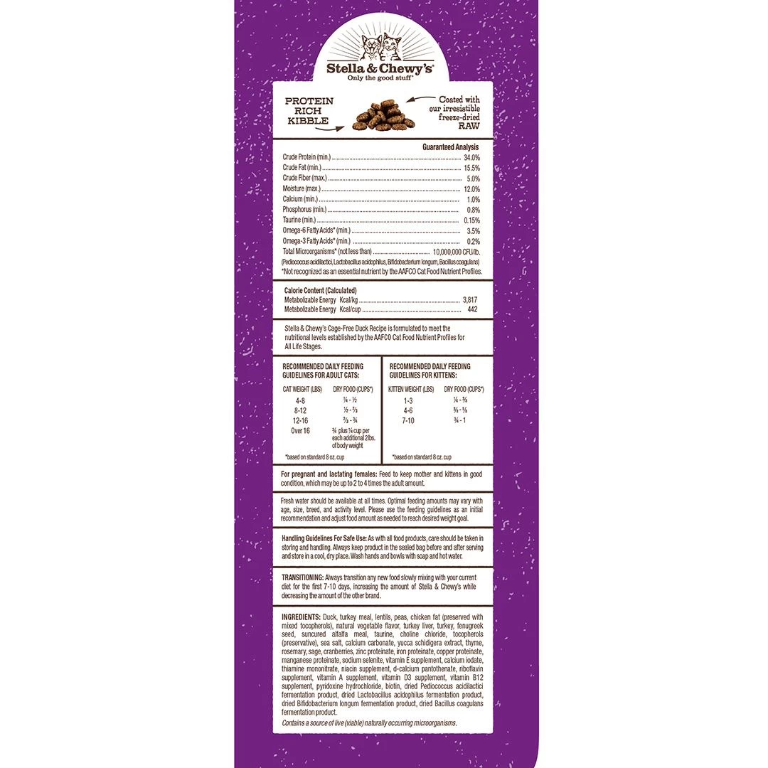 Duck, turkey meal, lentils, peas, chicken fat (preserved with mixed tocopherols), natural vegetable flavor, turkey liver, turkey, fenugreek seed, sun-cured alfalfa meal, salmon oil, taurine, choline chloride, tocopherols (preservative), sea salt, calcium carbonate, yucca schidigera extract, thyme, rosemary, sage, cranberries, zinc proteinate, iron proteinate, copper proteinate, manganese proteinate, sodium selenite, vitamin E supplement, calcium iodate, thiamine mononitrate, niacin supplement, d-calcium pantothenate, riboflavin supplement, vitamin A supplement, vitamin D3 supplement, vitamin B12 supplement, pyridoxine hydrochloride, biotin, dried Pediococcus acidilactici fermentation product, dried Lactobacillus acidophilus fermentation product, dried Bifidobacterium longum fermentation product, dried Bacillus coagulans fermentation product.