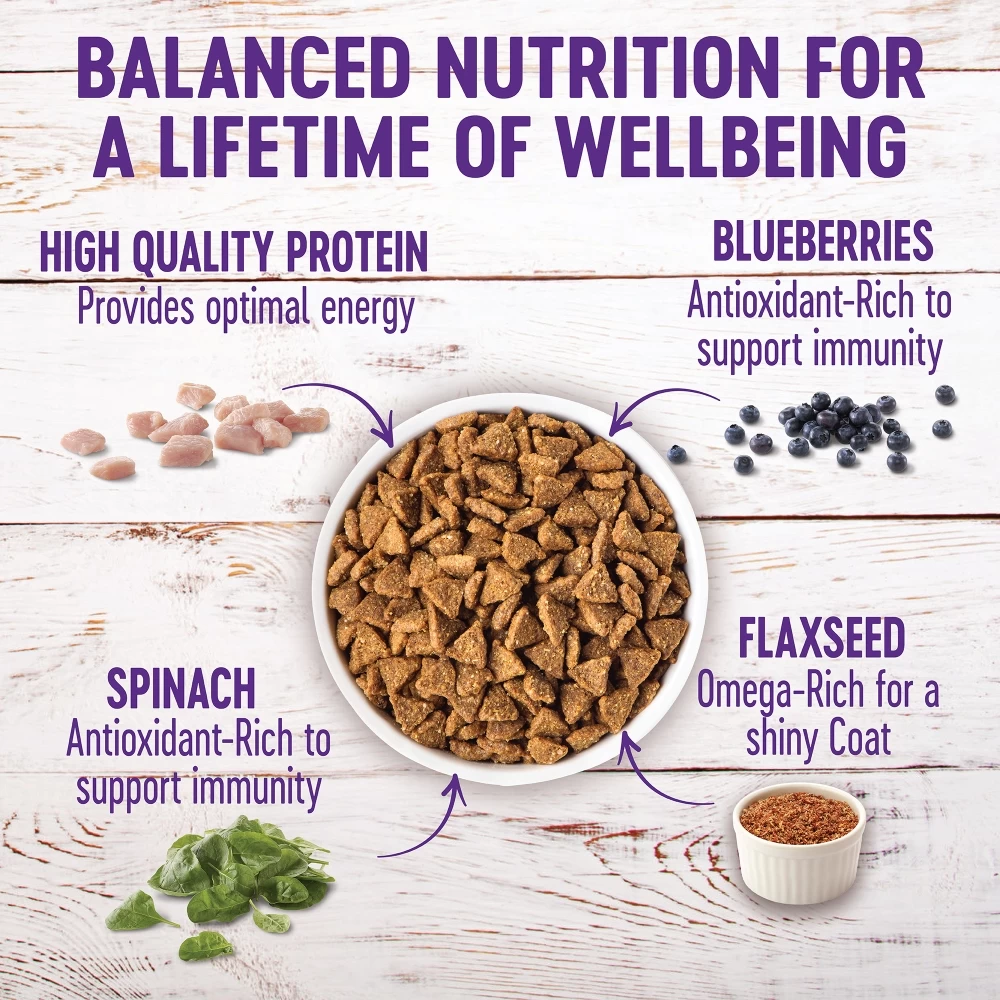 Deboned Turkey, Chicken Meal, Ground Brown Rice, Peas, Rice, Oats, Chicken Fat (preserved with Mixed Tocopherols), Tomato Pomace, Ground Flaxseed, Tomatoes, Pea Fiber, Natural Chicken Flavor, Carrots, Spinach, Potassium Chloride, Choline Chloride, Sweet Potatoes, Blueberries, Apples, Mixed Tocopherols added to preserve freshness, Vitamin E Supplement, L-Ascorbyl-2-Polyphosphate, Chicory Root Extract, Yucca Schidigera Extract, Taurine, Zinc Proteinate, Zinc Sulfate, Calcium Carbonate, Niacin, Ferrous Sulfate, Iron Proteinate, Vitamin A Supplement, Glucosamine Hydrochloride, Chondroitin Sulfate, Ascorbic Acid (Vitamin C), Copper Sulfate, Thiamine Mononitrate, Copper Proteinate, Manganese Proteinate, Manganese Sulfate, d-Calcium Pantothenate, Sodium Selenite, Pyridoxine Hydrochloride, Riboflavin, Biotin, Vitamin D3 Supplement, Calcium Iodate, Vitamin B12 Supplement, Folic Acid, Dried Lactobacillus plantarum Fermentation Product, Dried Enterococcus faecium Fermentation Product, Dried Lactobacillus casei Fermentation Product, Dried Lactobacillus acidophilus Fermentation Product, Rosemary Extract, Green Tea Extract, Spearmint Extract.