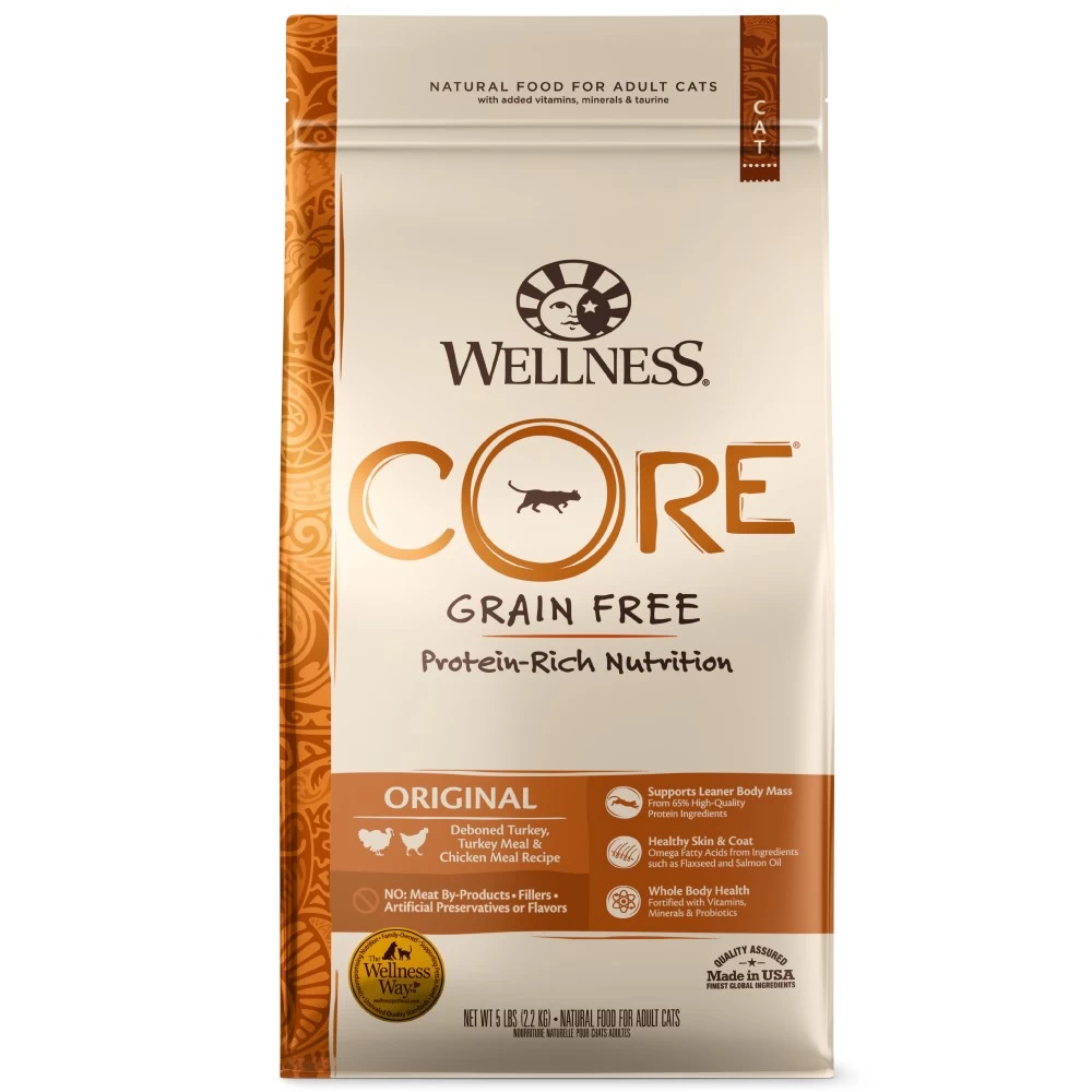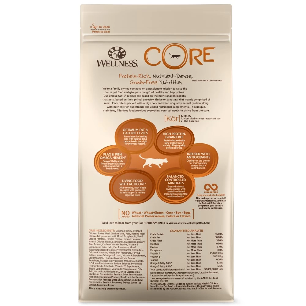 Wellness CORE Natural Grain Free Dry Cat Food Original Turkey, Chicken, Whitefish & Herring Recipe is healthy, 100% natural grain free cat food for adult cats made with turkey, chicken, whitefish, herring, salmon oil and cranberries to help support your cat’s optimal health and fortified with antioxidants, probiotics, vitamins and minerals, including fish and flax omega blend for healthy skin and coat. Wellness CORE grain free cat food formulas are based on the nutritional philosophy that cats thrive on a diet mainly comprised of meat. Each grain free, nutrient-rich formula provides high quality protein for your cat with no meat by-products or fillers, grain, corn, soy, wheat-gluten or artificial preservatives, colors or flavors.