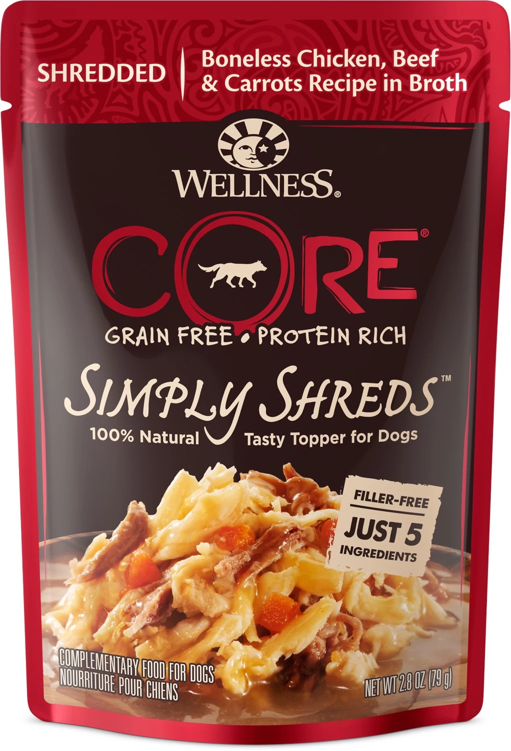 Chicken, Chicken Broth, Water Sufficient For Processing, Beef, Carrots. 47 kcal/pouch