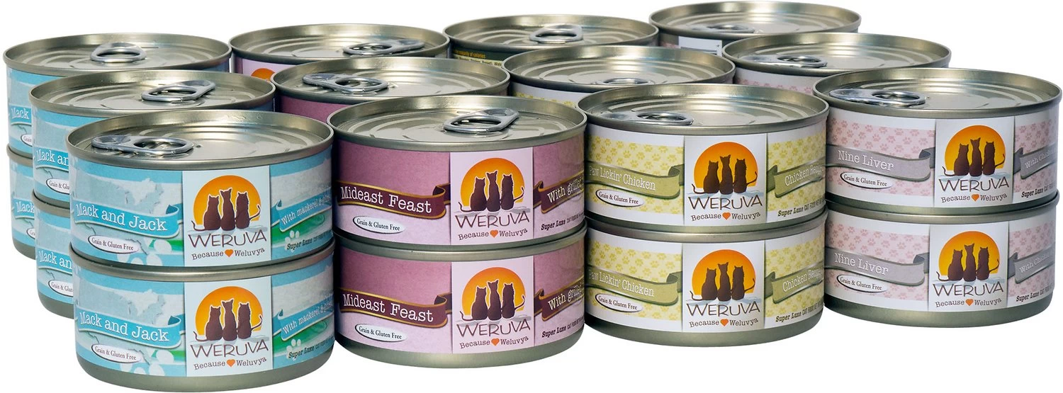 Mack and Jack: Tuna Red Meat, Mackerel Flakes, Water Sufficient for Processing, Skipjack, Sunflower Seed Oil, Locust Bean, Carrageenan, Sunflower Seed Oil, Dicalcium Phosphate, Guar Gum, Choline Chloride, Taurine, Vitamin E Supplement, Zinc Sulfate, Thiamine Mononitrate (Vitamin B1), Nicotinic Acid (Vitamin B3), Ferrous Sulfate, Calcium Pantothenate, Vitamin A Supplement, Potassium Iodide, Manganese Sulfate, Vitamin D3 Supplement, Copper Sulfate, Riboflavin Supplement (Vitamin B2), Pyridoxine Hydrochloride (Vitamin B6), Folic Acid, Menadione Sodium Bisulfite Complex (Source of Vitamin K), Vitamin B12 Supplement. Mideast Feast: Tuna Whole Meat, Water Sufficient for Processing, Tilapia, Potato Starch, Sunflower Seed Oil, Dicalcium Phosphate, Xanthan Gum, Choline Chloride, Taurine, Vitamin E Supplement, Zinc Sulfate, Thiamine Mononitrate (Vitamin B1), Nicotinic Acid (Vitamin B3), Ferrous Sulfate, Calcium Pantothenate, Vitamin A Supplement, Potassium Iodide, Manganese Sulfate, Vitamin D3 Supplement, Copper Sulfate, Riboflavin Supplement (Vitamin B2), Pyridoxine Hydrochloride (Vitamin B6), Folic Acid, Menadione Sodium Bisulfite Complex (Source of Vitamin K), Vitamin B12 Supplement. Nine Liver: Chicken (Boneless, Skinless, White Breast), Water Sufficient for Processing, Chicken Liver, Potato Starch, Sunflower Seed Oil, Xanthan Gum, Dicalcium Phosphate, Choline Chloride, Taurine, Vitamin E Supplement, Zinc Sulfate, Thiamine Mononitrate (Vitamin B1), Nicotinic Acid (Vitamin B3), Ferrous Sulfate, Calcium Pantothenate, Vitamin A Supplement, Potassium Iodide, Manganese Sulfate, Vitamin D3 Supplement, Copper Sulfate, Riboflavin Supplement (Vitamin B2), Pyridoxine Hydrochloride (Vitamin B6), Folic Acid, Vitamin B12 Supplement. Paw Lickin’ Chicken: Chicken (Boneless, Skinless, White Breast), Water Sufficient for Processing, Potato Starch, Sunflower Seed Oil, Dicalcium Phosphate, Xanthan Gum, Choline Chloride, Taurine, Vitamin E Supplement, Zinc Sulfate, Thiamine Mononitrate (Vitamin B1), Nicotinic Acid (Vitamin B3), Ferrous Sulfate, Calcium Pantothenate, Vitamin A Supplement, Potassium Iodide, Manganese Sulfate, Vitamin D3 Supplement, Copper Sulfate, Riboflavin Supplement (Vitamin B2), Pyridoxine Hydrochloride (Vitamin B6), Folic Acid, Vitamin B12 Supplement. Mack & Jack: 93 kcal/can Mideast Feast: 116 kcal/can Nine Liver: 101 kcal/can Paw Lickin’ Chicken: 103 kcal/can
